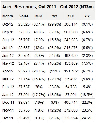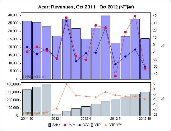 Acer has announced non-consolidated revenues of NT$24.36 billion (US$837.43 million) for November, down 4.58% on month and 31.88% on year, while the company's combined non-consolidated revenues for the first 11 months of 2012 reached NT$330.47 billion, down 11.33% on year.