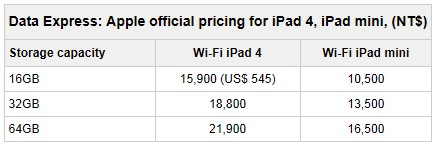 Apple started retail sales of the Wi-Fi iPad 4 and iPad mini in the Taiwan market on December 14, according to Data Express which is an Apple premium reseller in Taiwan.